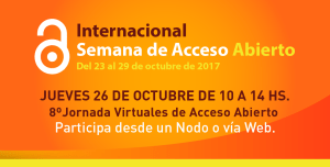 El jueves 26 de octubre de 2017, de 10 a 14 horas realizamos la 8º Jornada Virtuales de Acceso Abierto en Argentina 2017. Con una agenda dirigida a la divulgación del movimiento, mostrando ejemplos y proyectos concretos tanto para iniciar, como para fortalecer el trabajo en el acceso abierto al conocimiento científico. Dirigida a investigadores, docentes, estudiantes de posgrados y universitarios, bibliotecarios y autoridades. Como todos los años, la Jornada se transmite vía web y retransmite a través de nodos institucionales que quieran replicar la actividad (+ info).